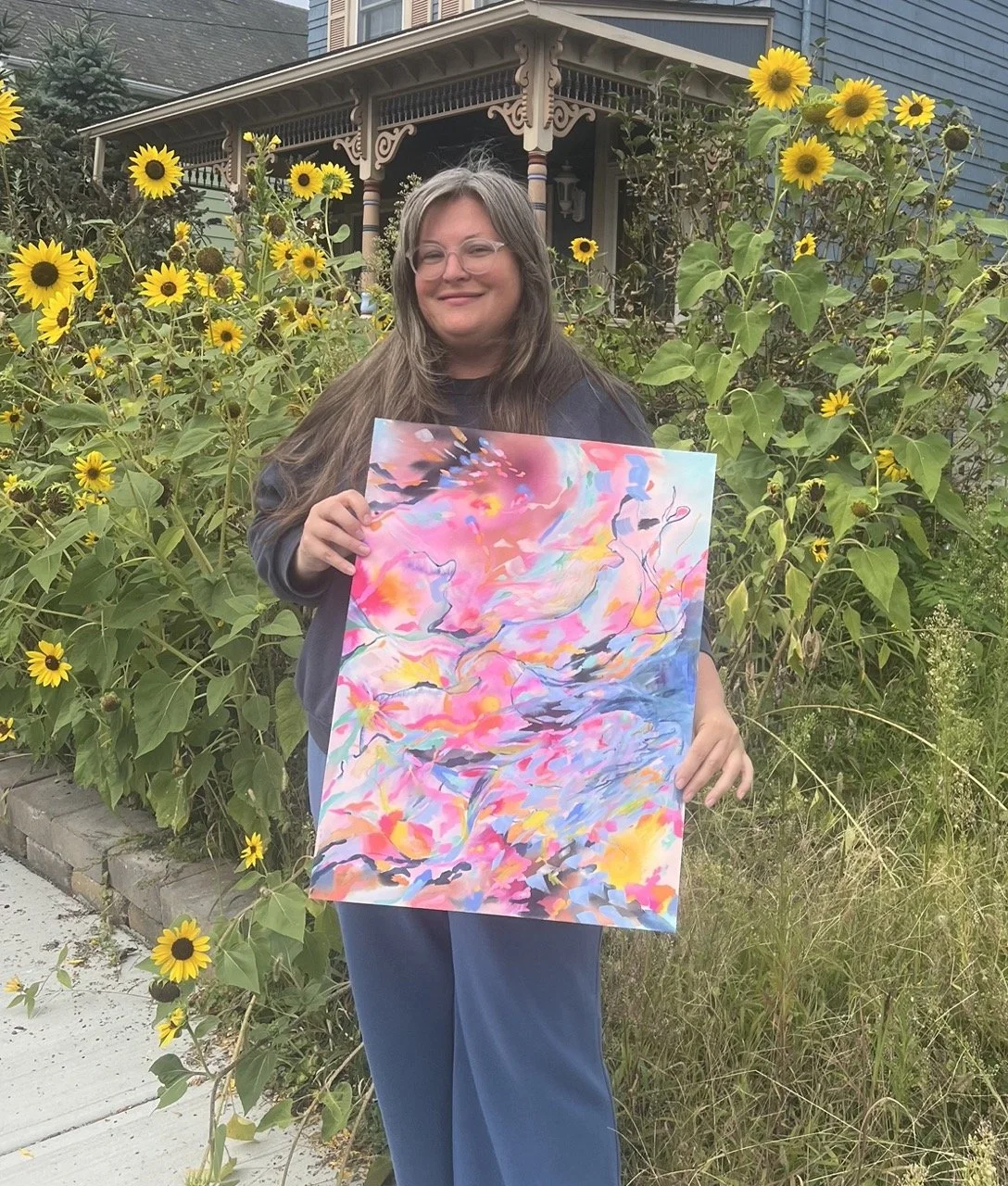 Jackie Dandelion is a multidisciplinary artist and transformational worker. Her artistic practice spans abstract expressionist painting, textile/surface pattern design, and wearable art. Rooted in intuition, her work draws inspiration from the shifting movements of light, water, and wind, exploring themes of impermanence and transformation.
